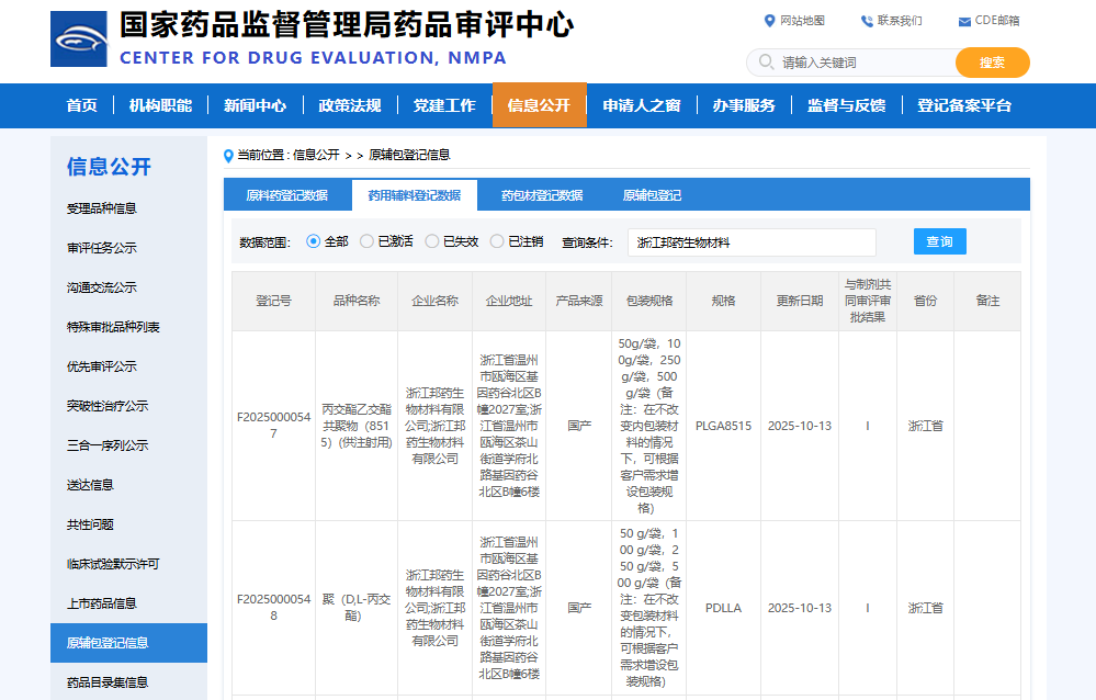 10月13日,国家药品监督管理局药品审评中心(CDE)官网更新显示,浙江邦药生物材料有限公司的药用辅料“丙交酯乙交酯共聚物(8515)(供注射用)”、“聚(D,L-丙交酯)”成功登记,登记号为“F20250000547”、“F20250000548”。