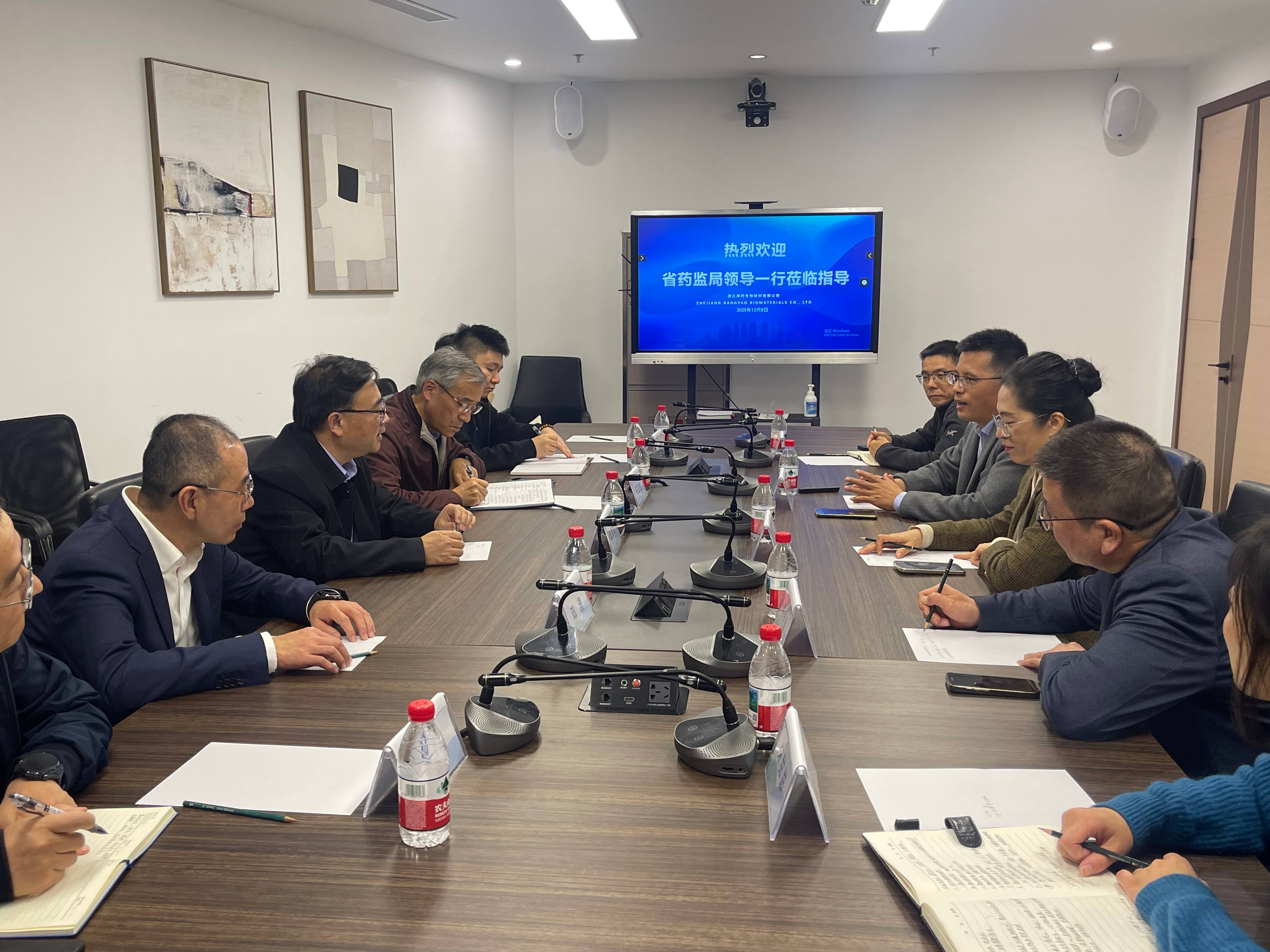 12月8日下午,浙江省药品监督管理局党组成员、药品安全总监张海军带队调研走访邦药生物,瓯海区区委常委吴雪梅陪同,参与此次调研的还有省药监局药品生产监督管理处处长王卫东,省药监局药品生产监督管理处主任科员郑照堃,温州市市场监管局党委委员、副局长邓湧,温州市市场监管局药品生产和化妆品监管处处长林峰、副处长虞剑泉,瓯海区市场监管局局长凌晓敏等。